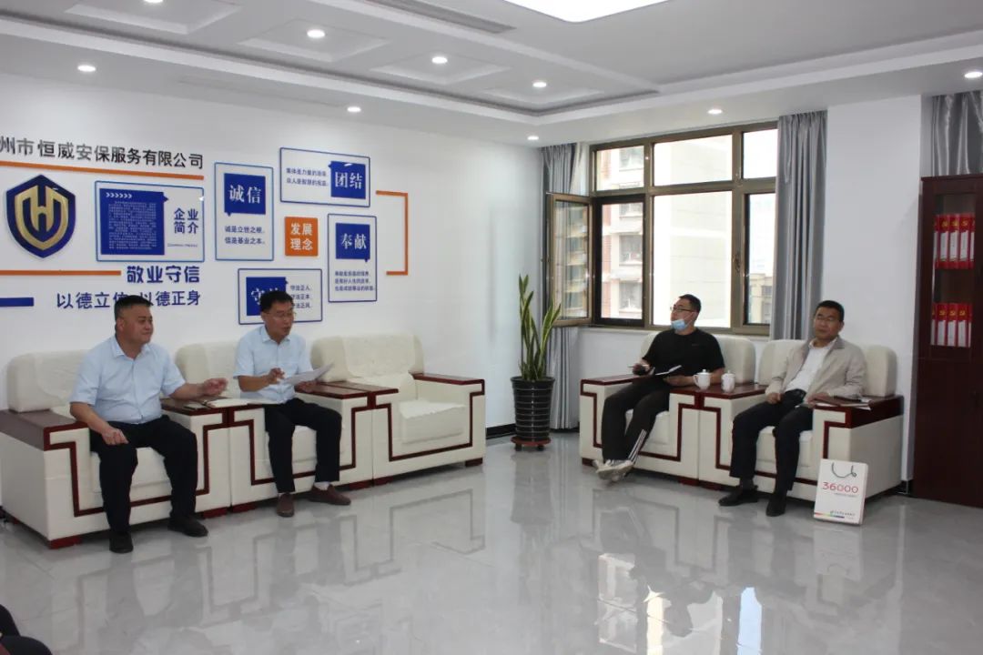 5月20日,中國郵政儲蓄銀行總經理崔慶十、王文成、及李振主任一行三人到訪德州市恒威安保服務有限公司走訪交流,洽談安保合作事宜。公司支部書記、總經理王新衛、副總經理張有利、高印東及大隊長李明參與來訪接待。