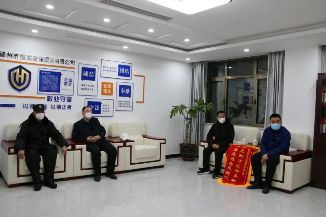 1月13日,德州市靜態交通有限公司呂強主任一行三人到訪德州市恒威安保有限公司,將寫有“恪盡職守無私奉獻 抗擊疫情為民解憂”錦旗交予恒威安保手中,公司副總經理張玉濤、張有利,七公司大隊長高榮海參與接待。