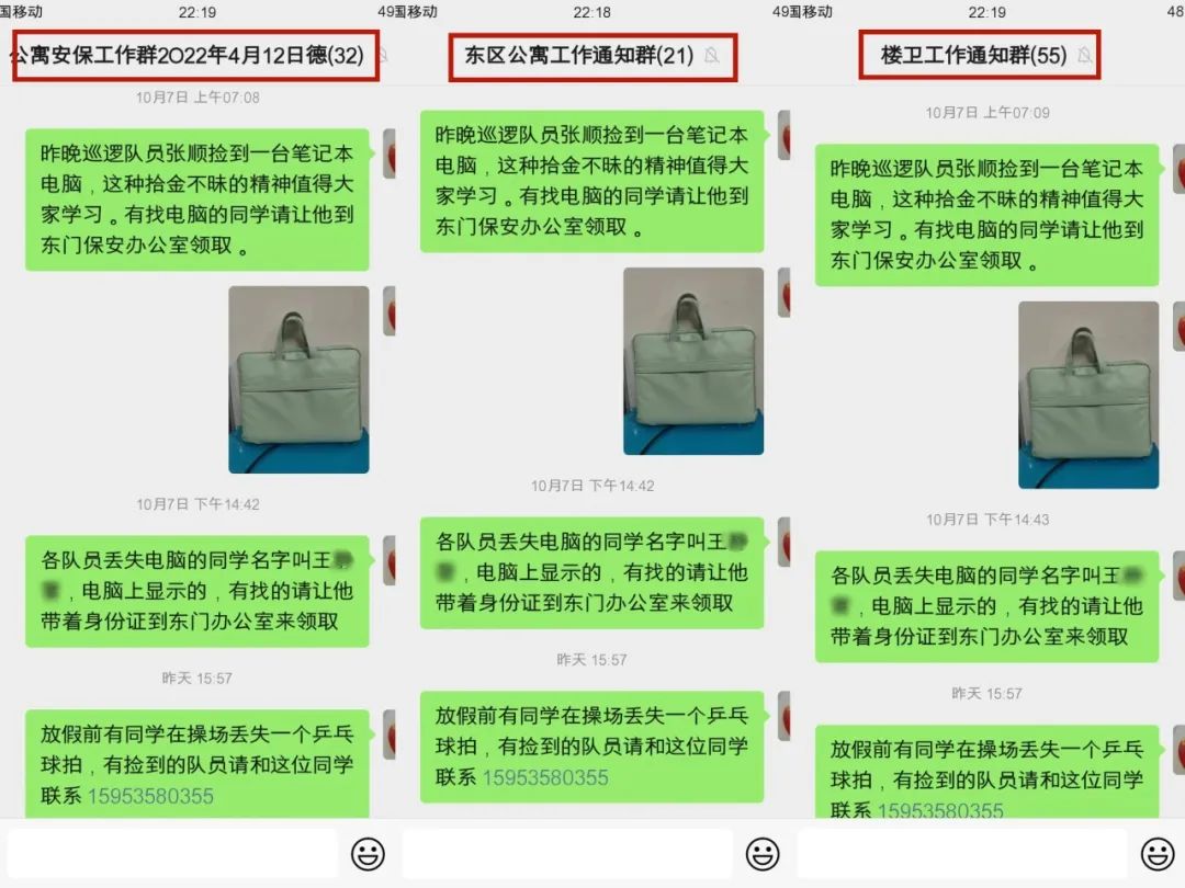 10月6日晚上,恒威安保駐德州學院班組保安員張順在校園例行巡邏過程中,在路過14號公寓時,看到一輛共享單車車把上掛著一個藍色辦公包,里面裝有筆記本電腦等物品,疑似被人遺忘在車上。張順擔心失主發現東西丟失后返回尋找,便在原地等待了半個小時,但失主遲遲未出現,張順便將現場情況向隊長劉明剛報告,并將電腦包移交校園警務室,同時在工作群中發布失物招領信息。