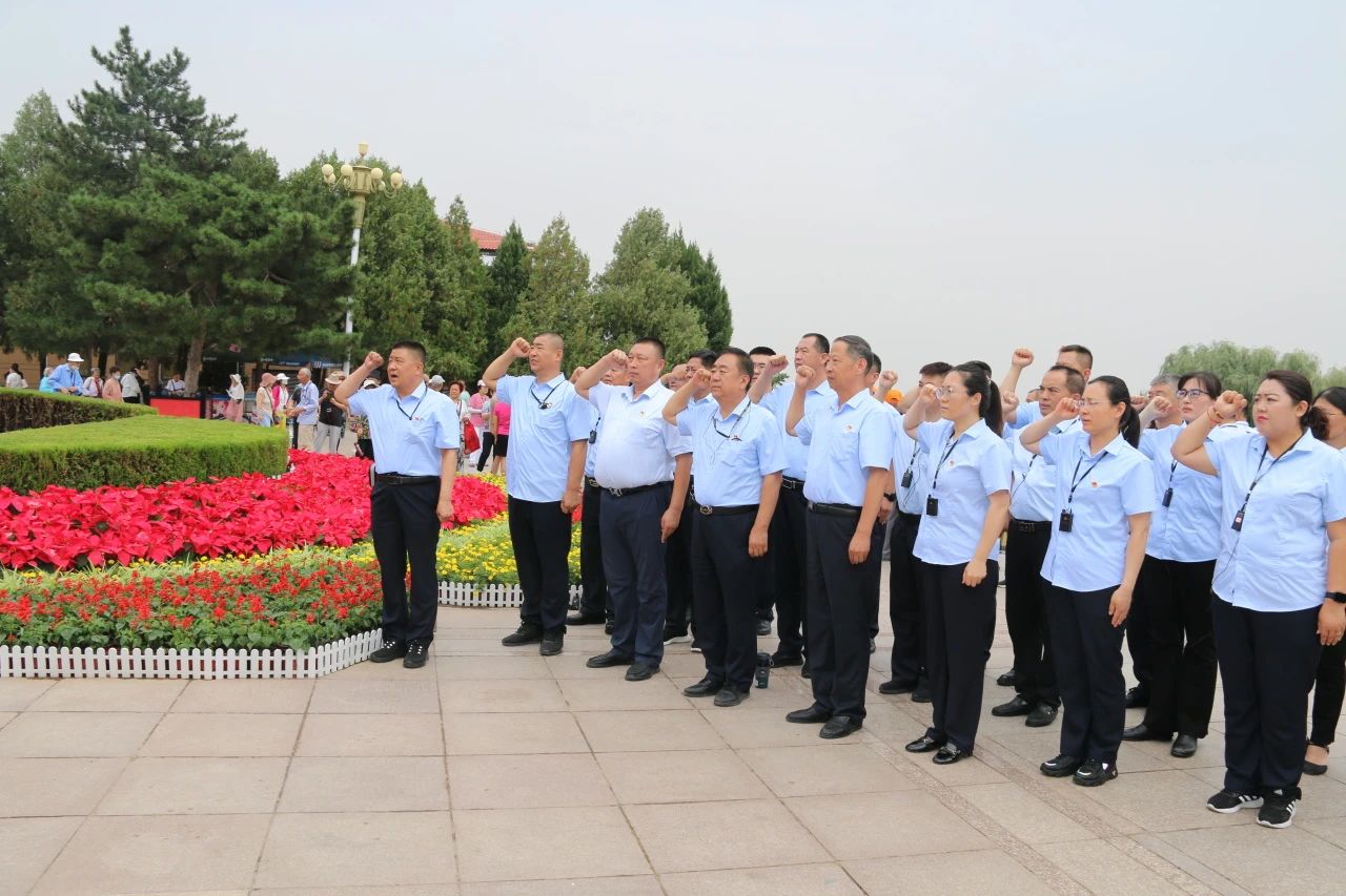 西柏坡紀念館廣場,面對鮮紅的黨旗,在黨支部副書記張玉濤的引領下,黨員們紛紛舉起右拳,莊嚴宣誓,“我志愿加入中國共產黨……”聲音鏗鏘,誓言豪邁,這一誓言不僅彰顯了全體黨員對黨的堅定信仰,更承載了他們對于黨的莊嚴承諾與責任擔當。