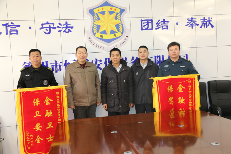 2019年12月26日下午,德州銀行領導賀經理、鄭科長一行兩人,蒞臨德州市恒威安保服務有限公司商洽工作并贈送“金融衛士、保衛安全”、“金融衛士、保駕護航”錦旗兩面。